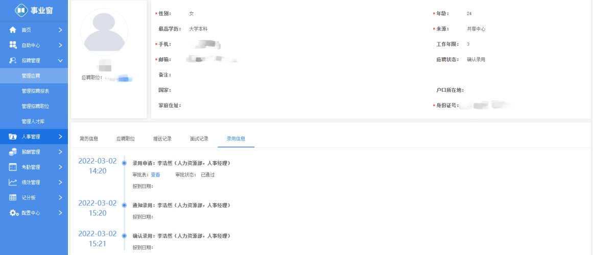 事业窗支持招聘职位的分权管理与流程审批,同时面试官可根据职位要求设置面试评估标准并填写面试反馈,使面试情况与招聘结果一目了然,便于招聘职位对应的用人部门上级与人事专员及时跟踪并掌握招聘进度,提高跨部门协作的沟通效率。候选人确认入职后,系统支持将招聘过程中的信息完整同步并创建相应的员工信息档案,大量节省人工处理信息的时间成本。